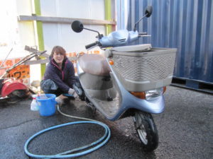 女性向けスクーター大容量のカゴにお買い物に最適なスクーターです~♬ ★走行距離:8,400キロとまだまだ十分低走行ですから十分長くお使いいただけます~~♬ 早速、洗車をして、メンテナンスです~~♬