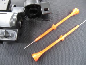 まずケースで、外観の傷はなく、留部や、ヒンジなどのメッキも綺麗です。内部も綺麗ですが、横に一つある留の金具にサビがあります。  バレルは金属で出来ているようでグリップや、矢を挿入する部分はプラスチック製です。