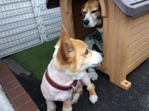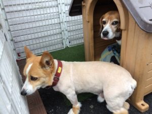 🐶今日のそうすけ店長とゴエモン家電担当副店長の会話? 2019/6/7 今日のそうすけ店長 ☆本日は福岡北部も梅雨入りのようで、曇りのち小雨の天候そうすけ店長を見に行くと口を開けてハッハ、ハッハト暑い様子?!お客さんも途切れてるんで、夏使用に!!何時もの様にちゃっちゃとバリカンで、、、。床屋も終わりサークルに入れるとゴエモン副店長が、そうすけ店長を見て、不格好さに”プ”と笑う~それを聞いてそうすけ店長が後ろを振り向くとゴエモン副店長は何もなかったように普段の表情!!(笑)(‘ω’)ノ