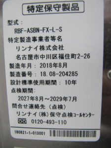 ■店舗手渡可 美品 リンナイ バランス釜 バランス風呂釜 RBF-ASBN-FX-L-S 2018年製