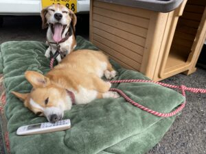 コンテナから少しお外に商品を出して暖かな毛布についついうたた寝(#^.^#)のソウスケ店長とゴエモン!