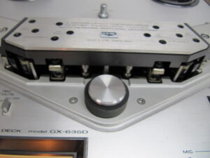 ①電源ON、その時点で画像④○部下のヘッド部のドライブシャフトは回転しています。画像③の各スイッチの出来ませんパイロットランプ右上の再生のみ点灯。左右のメーターは反応していることは確認いたしました。