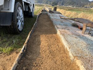 平面ブロックの盛り土も終了したので、ランマプレートでプレス後